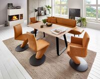 bestehend aus: Tisch, Asteiche massiv, Metallgestell: schwarz, 200x100 cm, in verschiedenen Größen und Ausführungen erhältlich, und Stuhl, Drehteller: schwarz, Leder, orange und Stuhl mit Armlehnen, Drehteller: schwarz, Stoff: orange, in verschiedenen Farben erhältlich