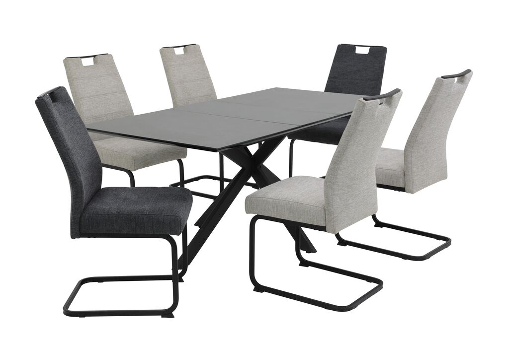bestehend aus: Tisch, Platte: sintered stone, grau, Metallgestell: schwarz, 180x90 cm und Stühlen, Stoff, grau, anthrazit, Edelstahlgestell: grau