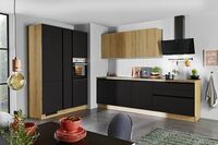 Eiche astig/Schwarz lack matt, 430 cm oder 150x280, in verschiedenen Zusammenstellungen und Farbkombinationen erhältlich. Einbaugeräte sowie Spüle gegen Mehrpreis