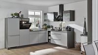 Hellgrau matt/Eiche grau, 305x230 cm, in verschiedenen Zusammenstellungen und Farbkombinationen erhältlich. Einbaugeräte sowie Spüle gegen Mehrpreis