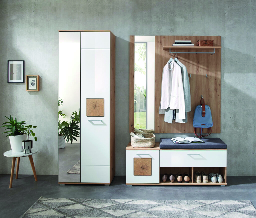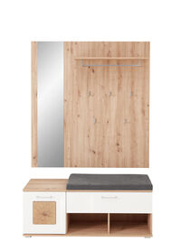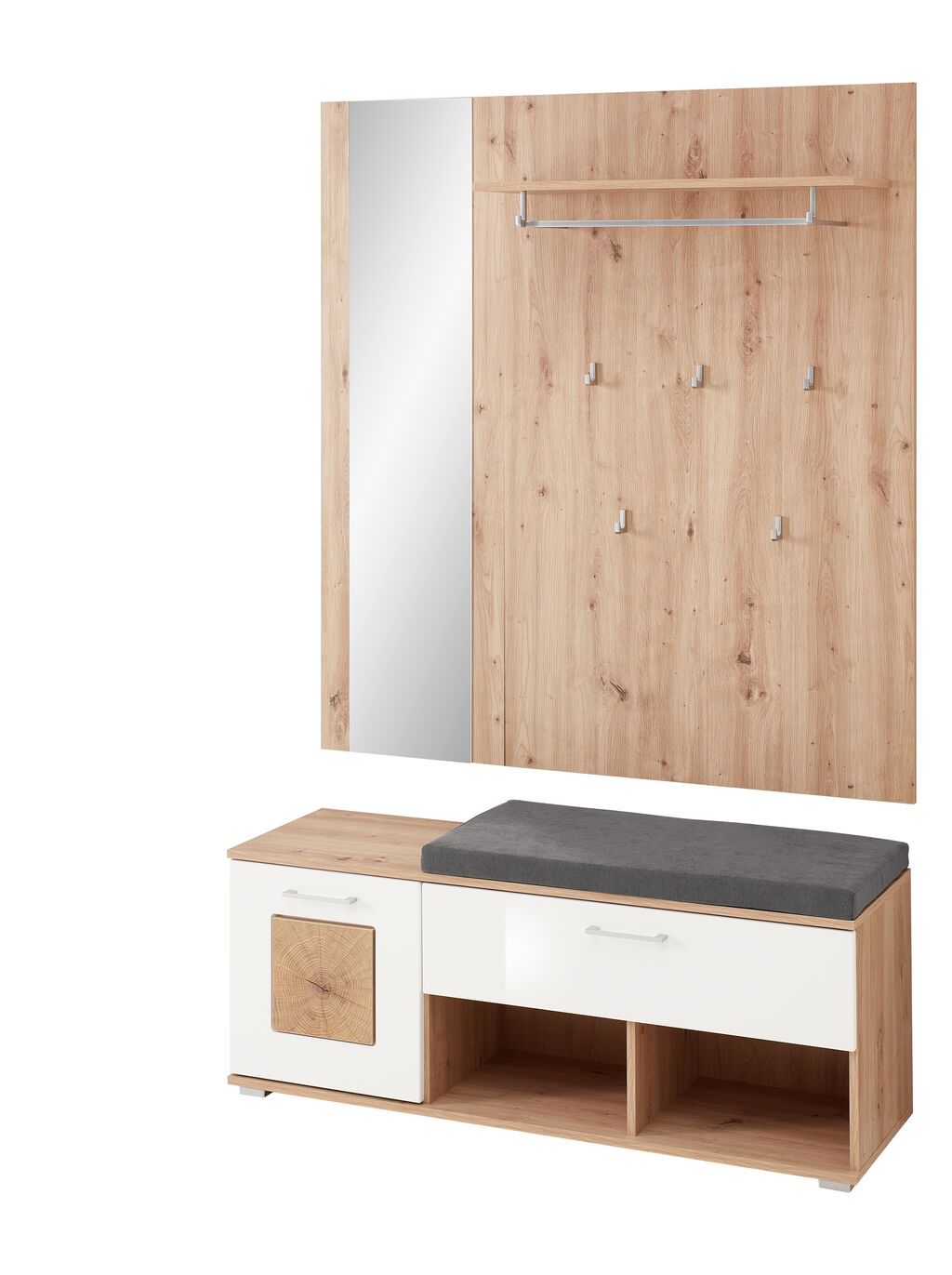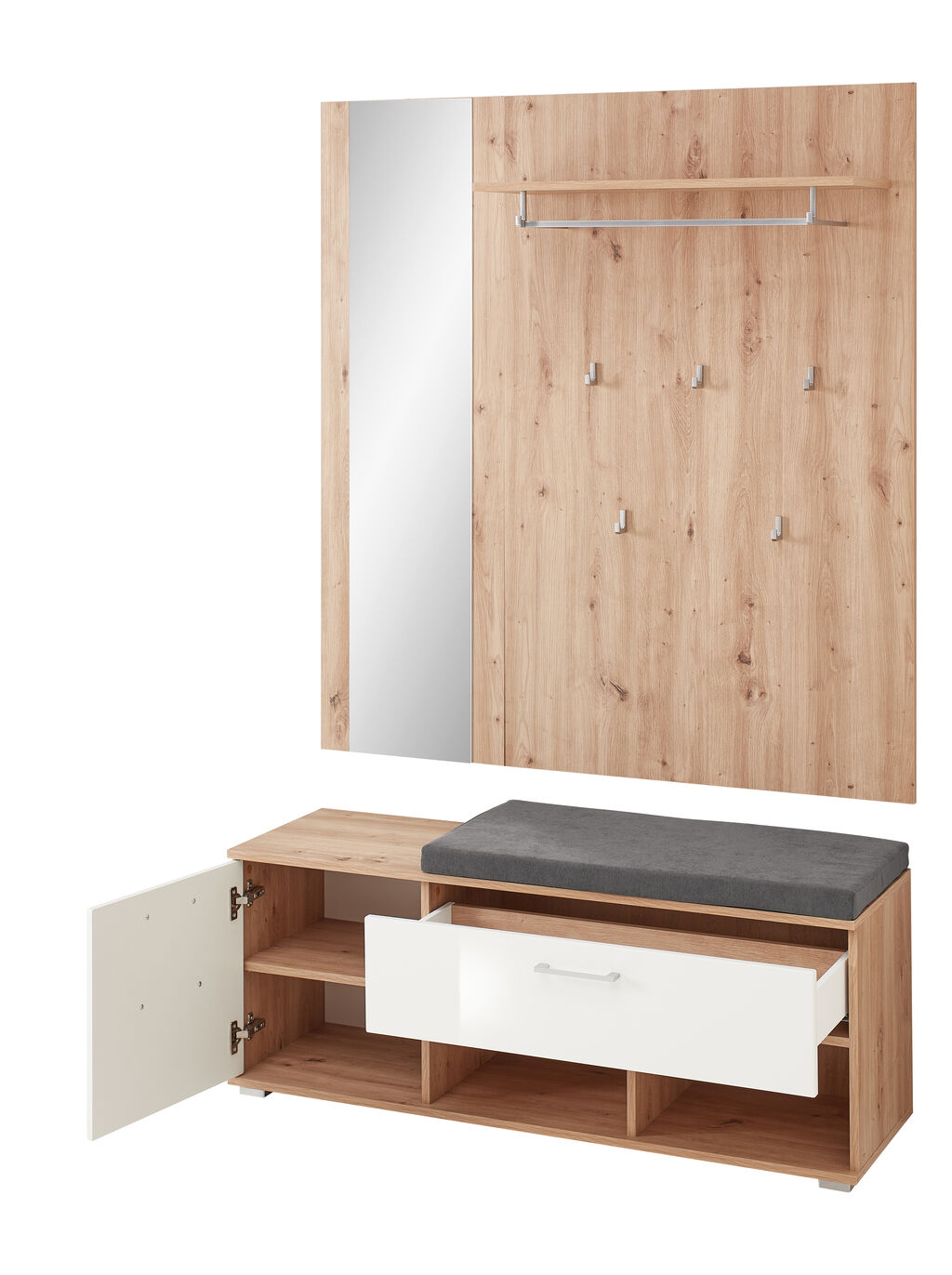 weiß Hochglanz/Artisan Eiche, inkl. 1 Schubkasten und Sitzkissen, Lederoptik, stahlgrau, BxHxT:126x193x38cm