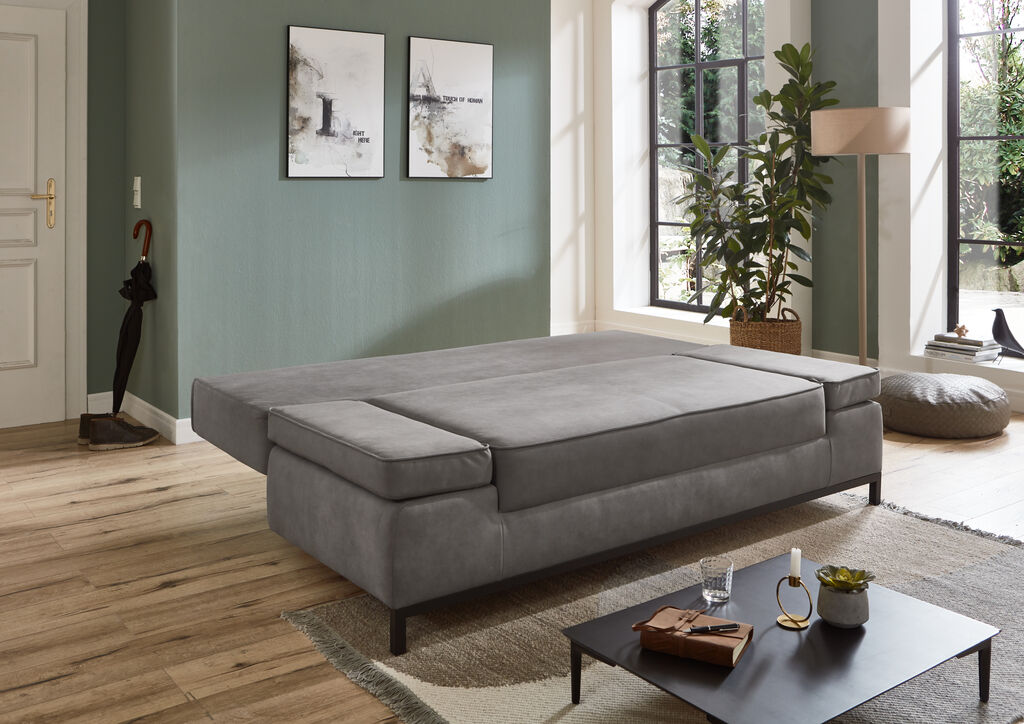 Stoff, silberfarben, inkl. Stauraum, Armteil hochklappbar, Liegefläche: 145x201 cm, Maße: 202x144 cm, in verschiedenen Farben erhältlich