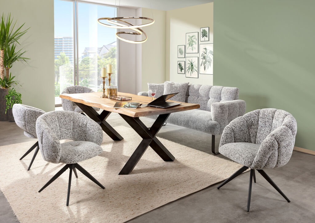 bestehend aus: Tisch, Mango massiv, Metallgestell: schwarz, 200x100 cm, Bank, Stoff: weiß-schwarz, Metallgestell: schwarz, BxHxT: 225x91x77 cm und Stuhl, Stoff: weiß-schwarz, Metallgestell: schwarz, um 360° drehbar, mit Armlehnen