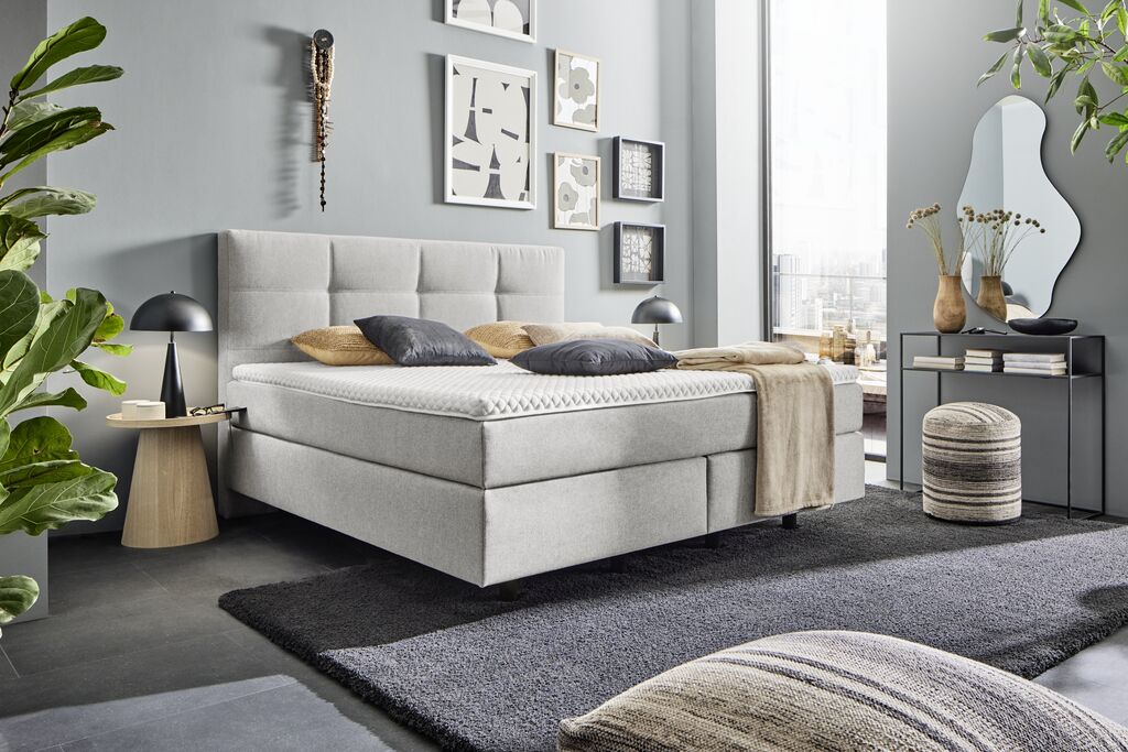 Stoff: hellgrau, Füße: schwarz, 180x200 cm, Unterbau: Bonell, inkl. Kopfteil und Taschenfederkernmatratze, in verschiedenen Größen und Farben erhältlich. Zubehör gegen Mehrpreis