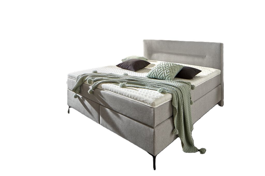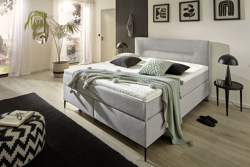 Stoff: hellgrau, Füße: Metall, schwarz, 180x200 cm, Unterbau: Bonell, inkl. Kopfteil, Taschenfederkernmatratze und Topper, in verschiedenen Größen und Farben erhältlich. Zubehör gegen Mehrpreis