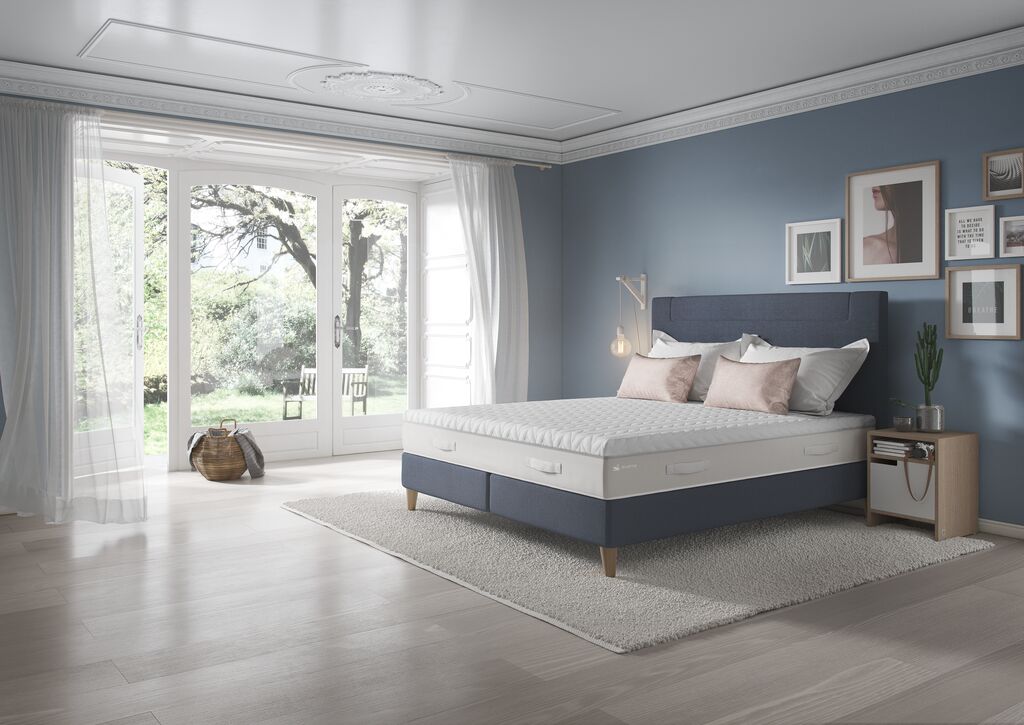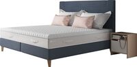 Stoff: blau, 180x200 cm, Box aus vollmassiver skandinavischer Fichte, Unterbau: EkoPocket Taschenfederken, inkl. Kopfteil und Matratzen mit dynamischem Zonensystem und 6 cm IntelliGel®, in verschiedenen Größen und Farben erhätlich. Nachtkommode gegen Mehrpreis