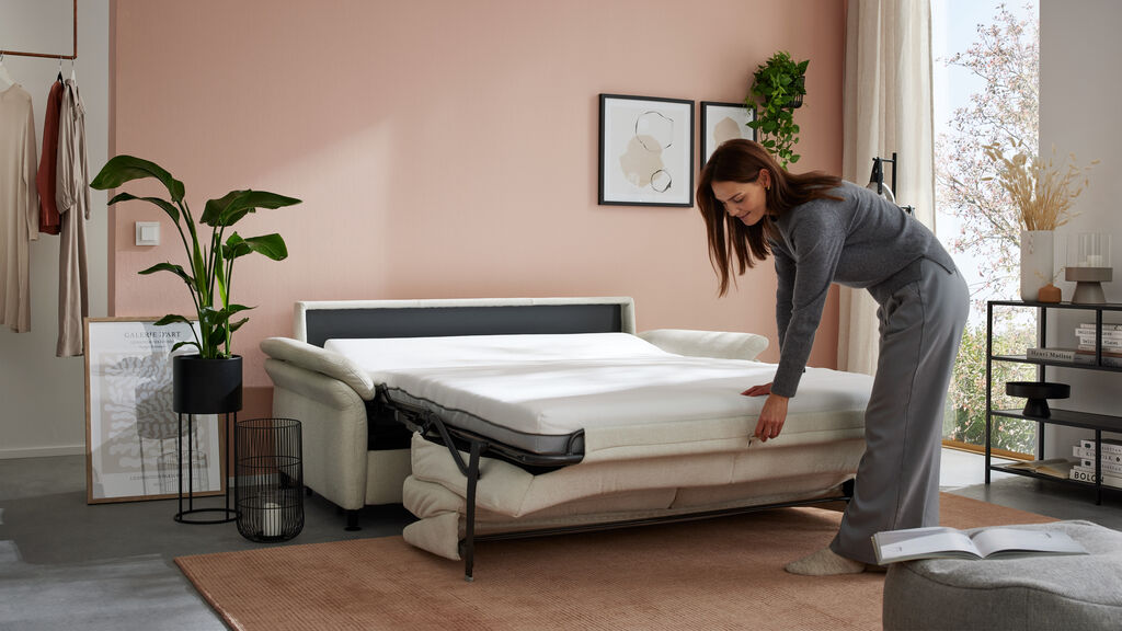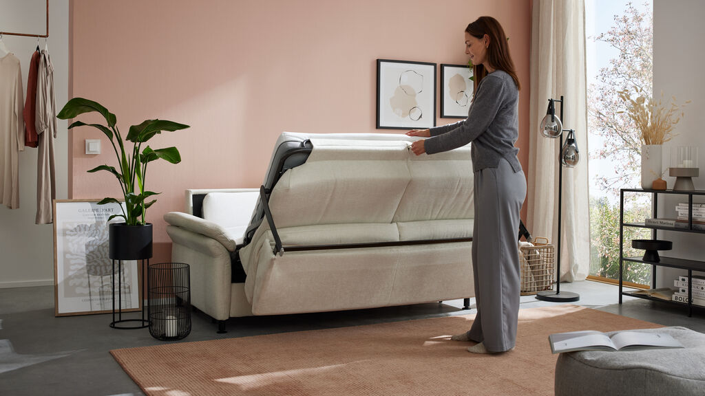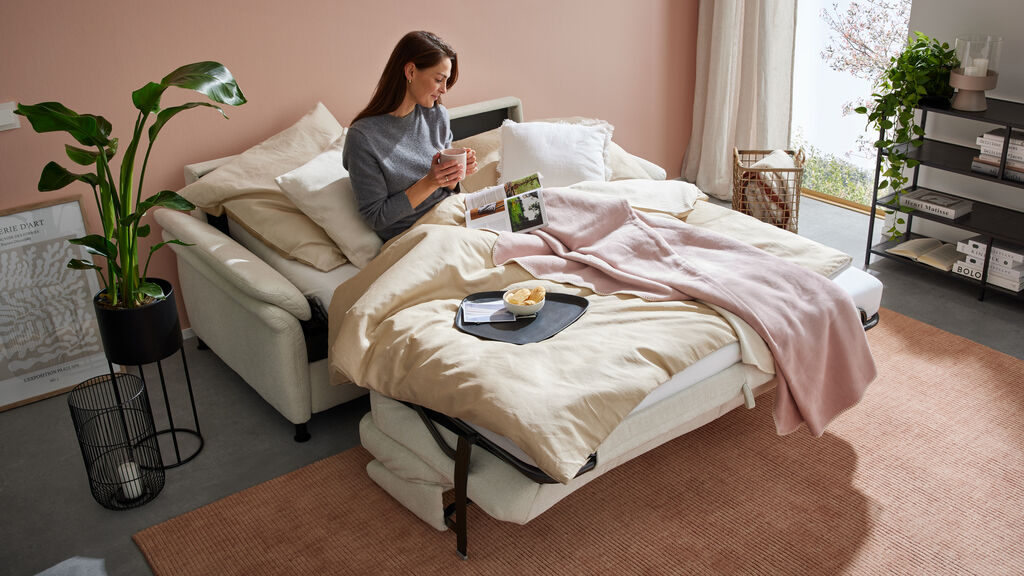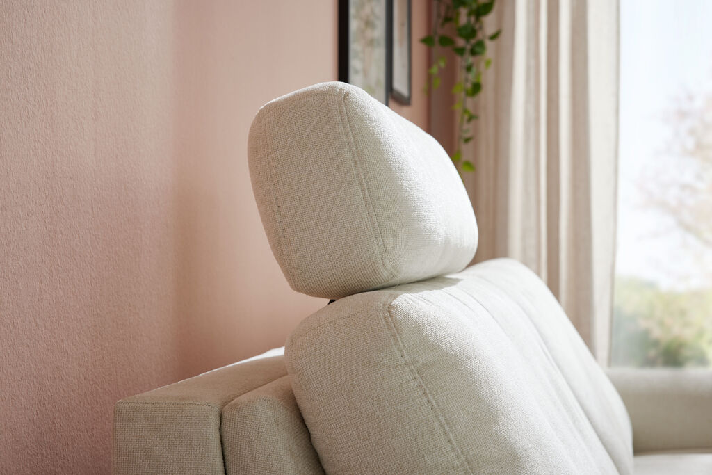 Stoff, beige, Füße: schwarz/matt, Liegefläche: 140x200 cm, Maße: 188x92x100 cm, in verschiedenen Farben erhältlich. Kopfstützen, Rücken echt, Matratze in Taschenfederkern und Kissen gegen Mehrpreis