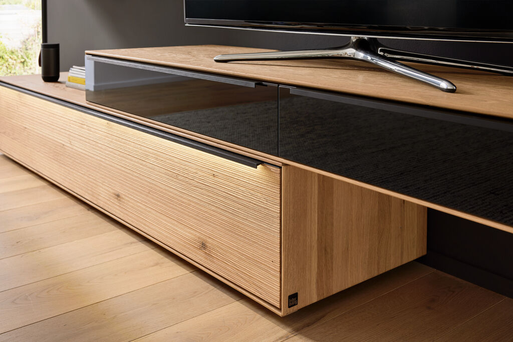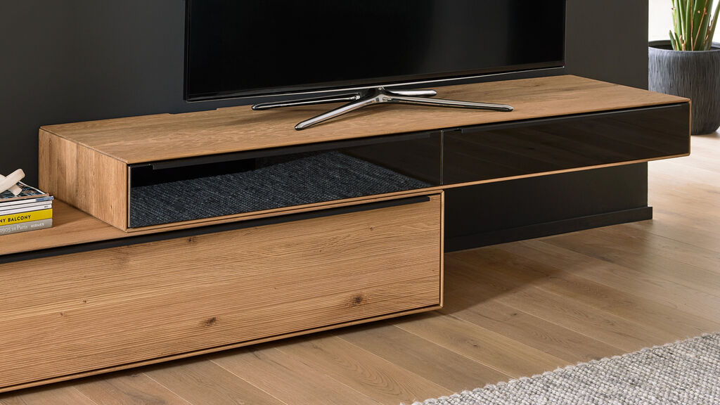 Asteiche massiv bianco/grau, Griffe: anthrazit, Breite: 244 cm. Beleuchtung und Funkdimmer gegen Mehrpreis