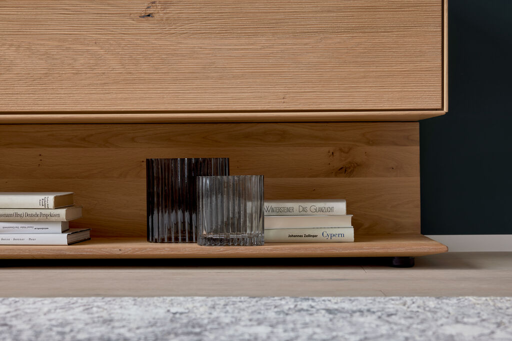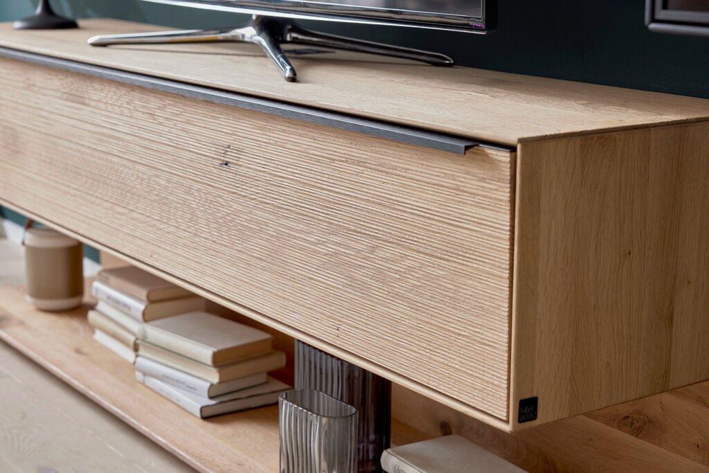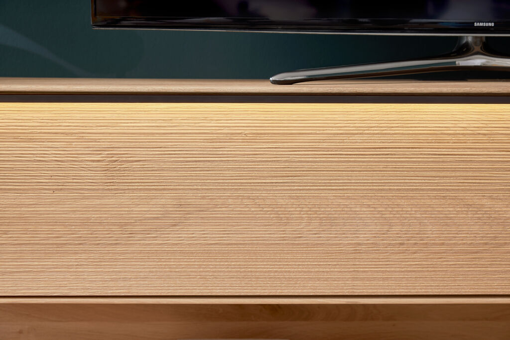 Asteiche massiv bianco/grau, Griffe: anthrazit, Breite: 266 cm. Kabeldurchlass, Beleuchtung, Funkdimmer und Holzrückwand gegen Mehrpreis
