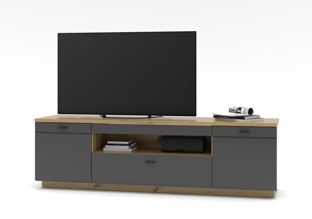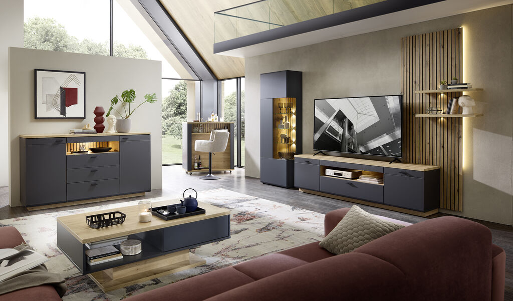 graphit supermatt/Artisan Eiche, Griffe: Alu/schwarz, inkl. Beleuchtung, BxHxT: 250x229x47 cm, in verschiedenen Zusammenstellungen erhältlich. Vitrine gegen Mehrpreis