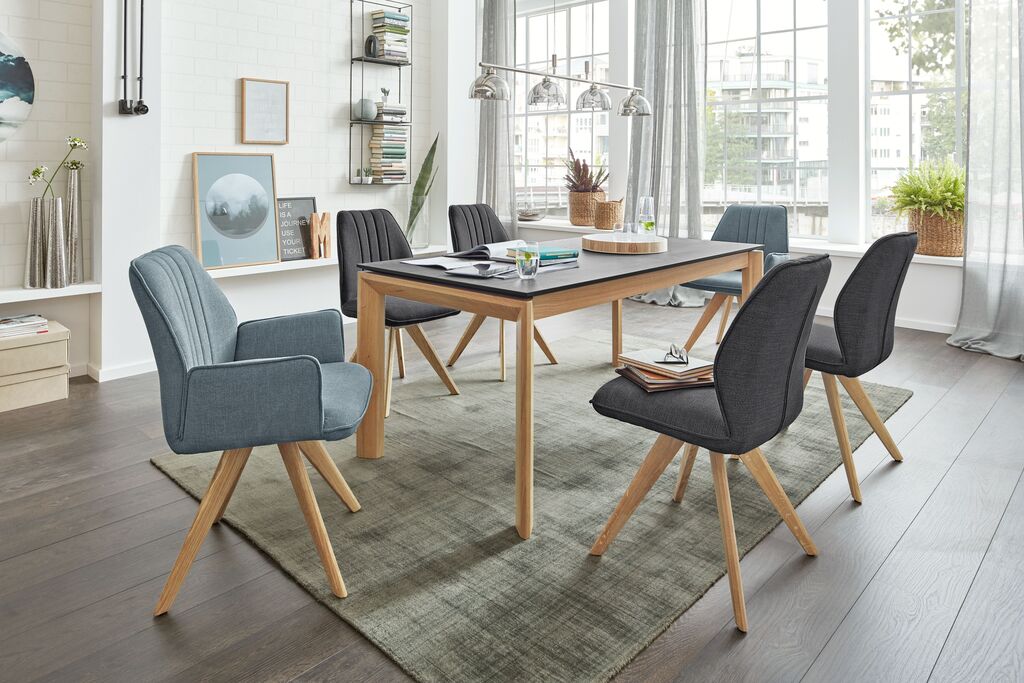 bestehend aus: Tisch, Keramik anthrazit marmoriert, ausziehbar, 160(200)x90 cm, Metallgestell: schwarz und Stühlen, Stoff: anthrazit, Metallgestell: schwarz, mit und ohne Armlehnen, in verschiedenen Farben erhältlich