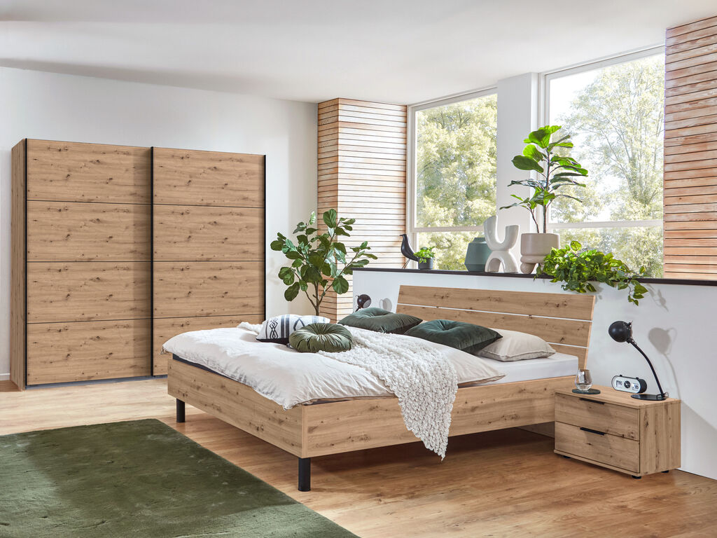 Artisan Eiche, bestehend aus: 2-türigem Schrank, BxHxT: 225x208x65 cm, Bett mit Kopfteil, 180x200 cm, mit schwarzen Füßen, und Nachttischen mit 2 Schubläden und schwarzen Griffen, BxHxT: 104x40x22 cm