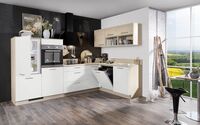 Weiß Hochglanz/Eiche natur, 305x185 cm, in verschiedenen Zusammenstellungen und Farbkombinationen erhältlich. Einbaugeräte sowie Spüle gegen Mehrpreis