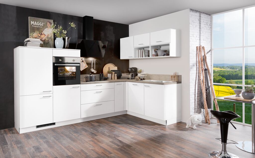 Weiß, 305x185 cm, inkl. aller angeführten Edelstahl Einbaugeräte, in verschiedenen Zusammenstellungen und Farbkombinationen erhältlich. Geschirrspüler sowie Spüle gegen Mehrpreis, 204680 inklusive: - Cerankochfeld - Einbauherd, Energieeffizienzklasse A - Dunstabzug, Energieeffizienzklasse B - Kühlschrank, Energieeffizienzklasse E