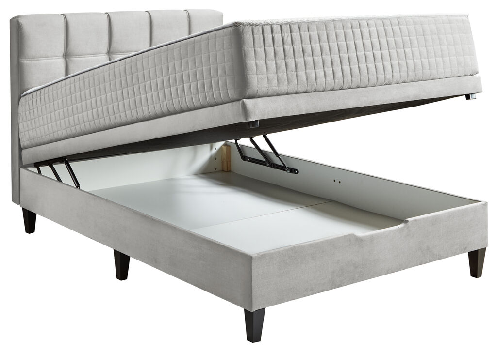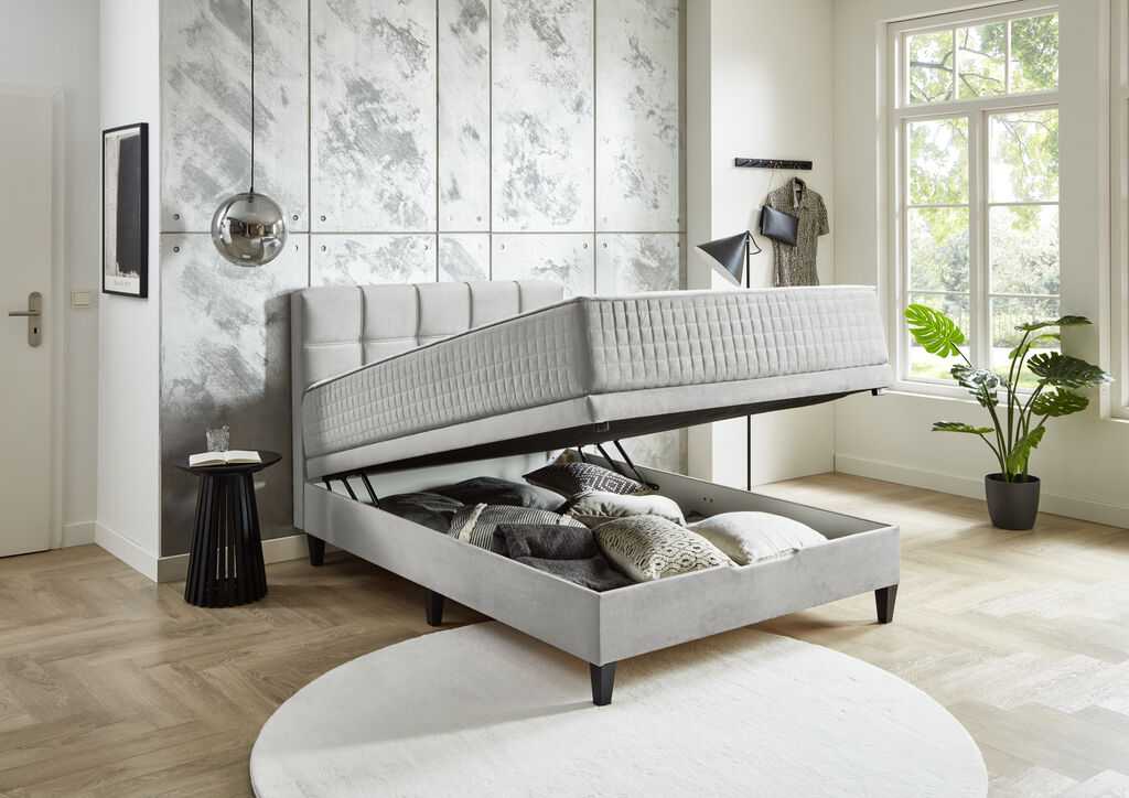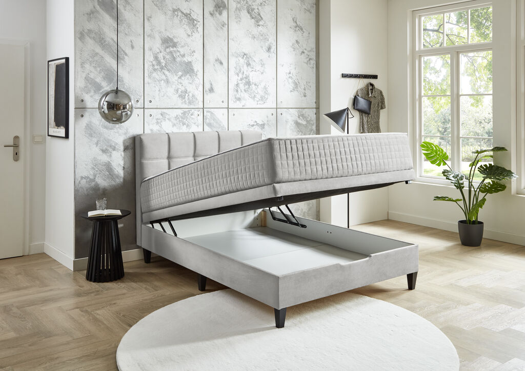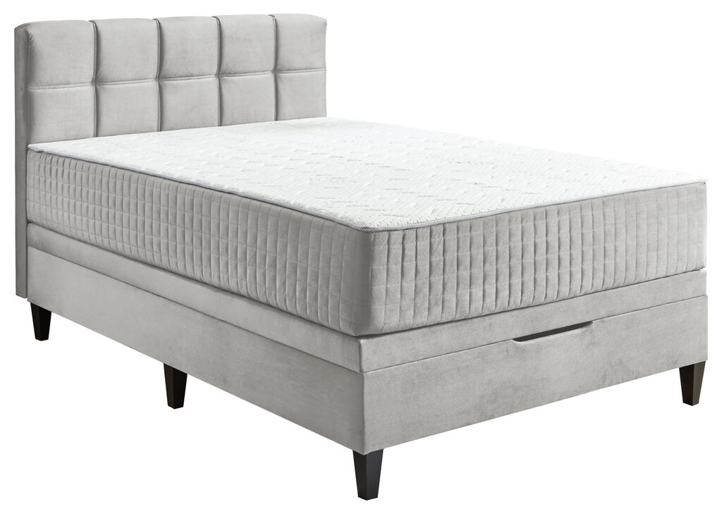 Stoff: silber, 140x200 cm, 2 Basisboxen, wendbare 7-Zonen Taschenfedernkernmatratze, Kopfteil mit Ziernähten
