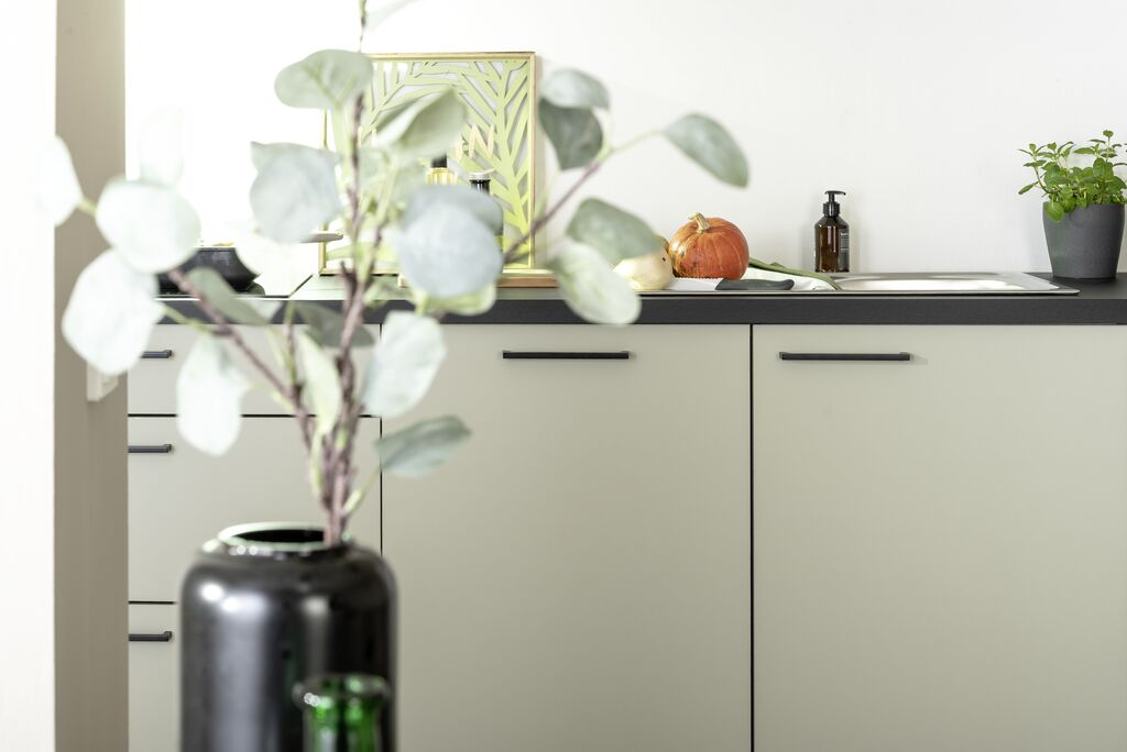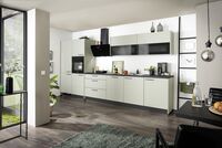 Salbei matt, ca.390 cm, in verschiedenen Zusammenstellungen und Farbkombinationen erhältlich. Einbaugeräte sowie Spüle gegen Mehrpreis