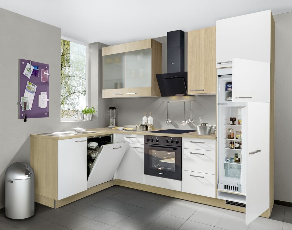 Weiß matt/Eiche natur, 175x275 cm, inkl. aller angeführten Edelstahl Einbaugeräte, in verschiedenen Zusammenstellungen und Farbkombinationen erhältlich. Geschirrspüler sowie Spüle gegen Mehrpreis, 204921