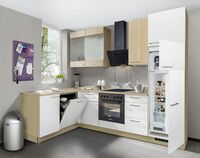 Weiß matt/Eiche natur, ca.175x275cm, in verschiedenen Zusammenstellungen und Farbkombinationen erhältlich. Einbaugeräte sowie Spüle gegen Mehrpreis