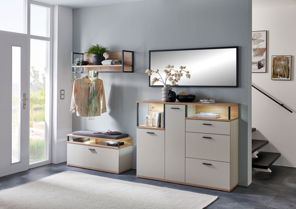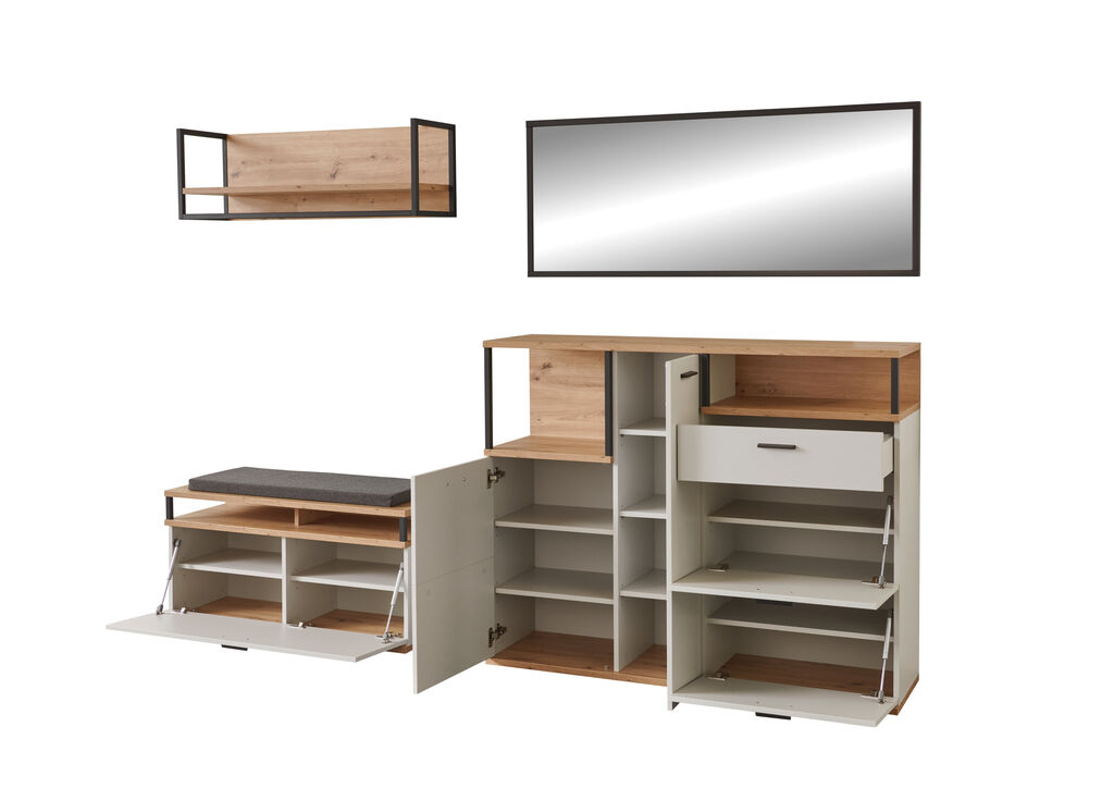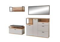 weiß/ Dekor: Artisan Eiche, bestehend aus: Bank, BxHxT: 100x50x37 cm, Kommode, BxHxT: 135x108x37 cm, Wandpaneel, BxHxT: 100x33x29 cm und Spiegel, BxHxT: 135x54x3 cm