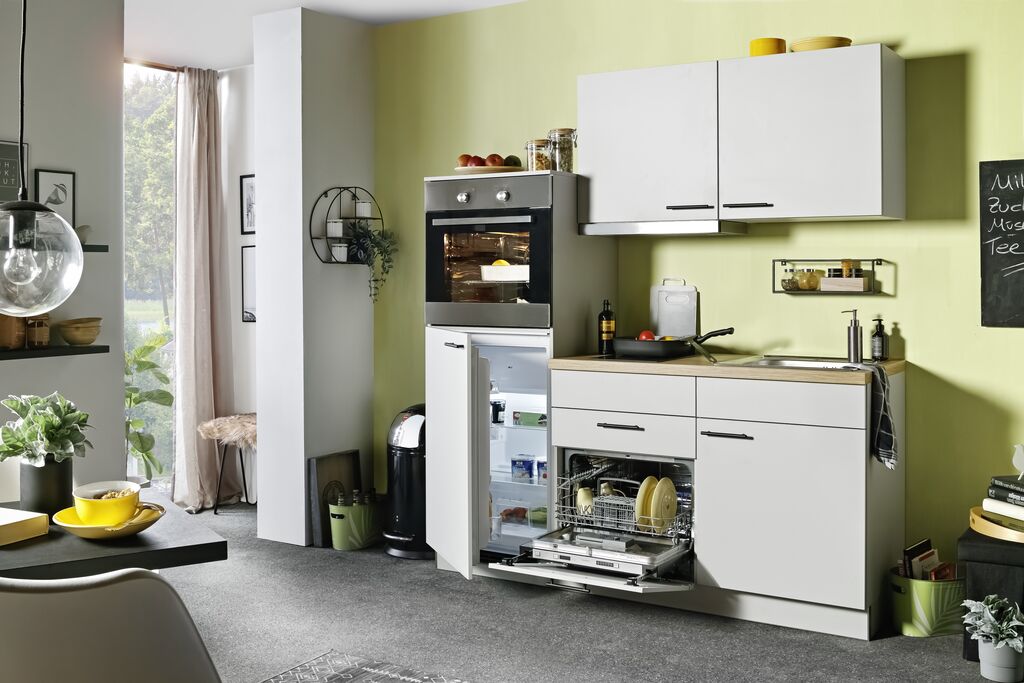 Hellgrau matt, 180 cm, inkl. aller angeführten Edelstahl Einbaugeräte, in verschiedenen Zusammenstellungen und Farbkombinationen erhältlich. Spüle gegen Mehrpreis, 204990 inklusive: - Glaskeramik-Kochfeld - Geschirrspüler, Energieeffizienzklasse F - Backofen, Energieeffizienzklasse A - Dunstabzug, Energieeffizienzklasse C - Kühlschrank, Energieeffizienzklasse E
