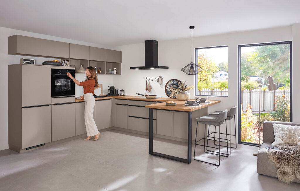 Macchiato, ca.305 x 336 cm + 170 cm Länge Tisch, inkl. aller angeführten Edelstahl Einbaugeräte, in verschiedenen Zusammenstellungen und Farbkombinationen erhältlich. Geschirrspüler sowie Spüle gegen Mehrpreis, 205073 inklusive: - Cerankochfeld - Backofen, Energieeffizienzklasse A - 90 cm Wandabzug, Energieeffizienzklasse A - 123 cm Kühlschrank, Energieeffizienzklasse E