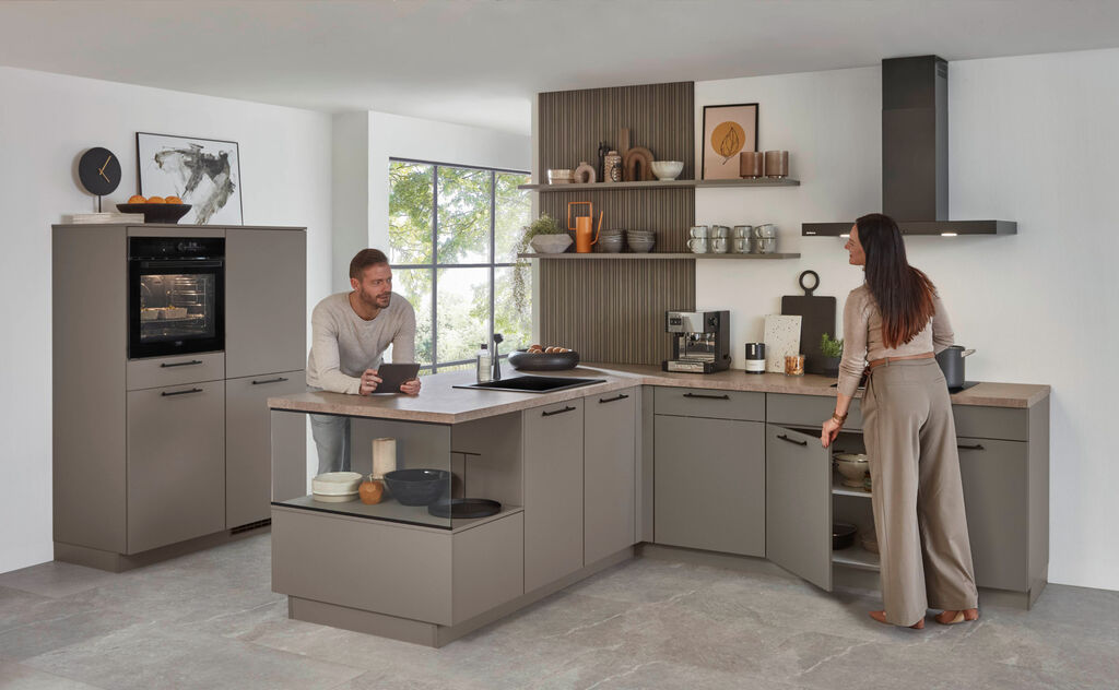 Taupegrau, ca.216 cm x 295 + 120 cm, in verschiedenen Zusammenstellungen und Farbkombinationen erhältlich. Einbaugeräte sowie Spüle gegen Mehrpreis