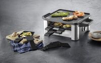 für 4 Personen, 1x Raklettgerät mit Wende-Grillplatte (24 x 36,5 x 12,2 cm, 870 W, Kabellänge 1,8m), 4x antihaftbeschichtete Pfännchen, 4x Raclette-Schieber