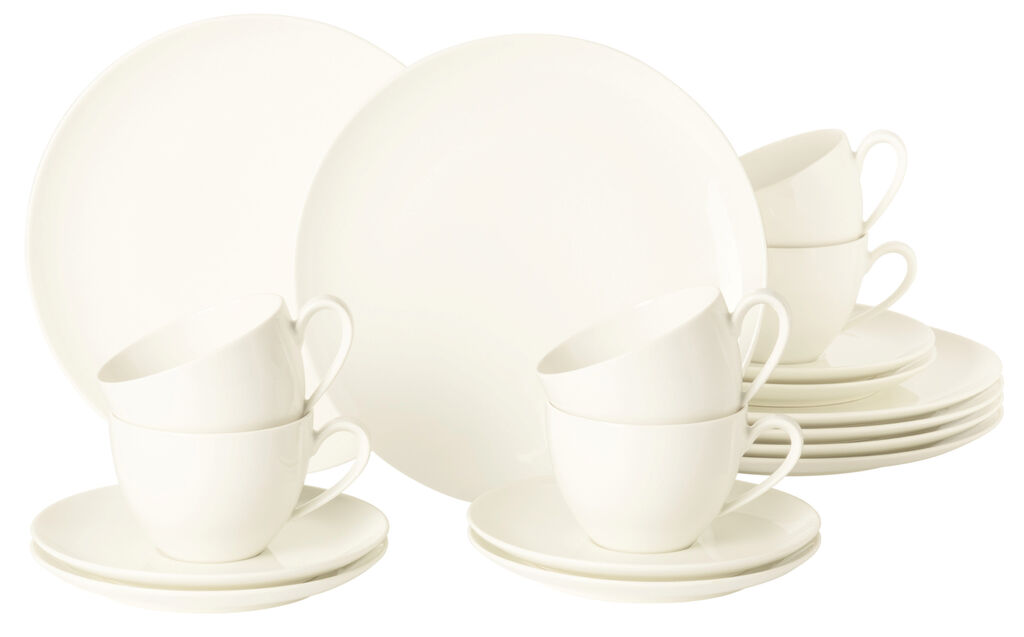 18-teilig, besteht aus: 6x Kaffeetassen, 6x Kaffeeuntertasse, 6x Teller, Hartporzellan, mikrowellen- & spülmaschinengeeignet