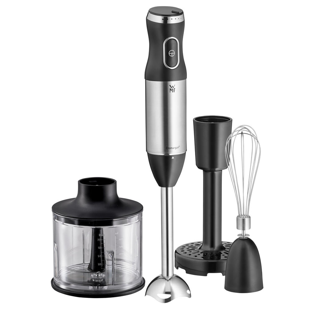 besteht aus: 1x Stabmixer aus Cromargan Edelstahl (8 x 6 x 39 cm, 600 Watt, Kabellänge 1m), 1x Schneebesen, 1x Stampfer, 1x Zerkleinerer, 1x Mixbehälter (700 ml) mit Skalierung, 600 Watt